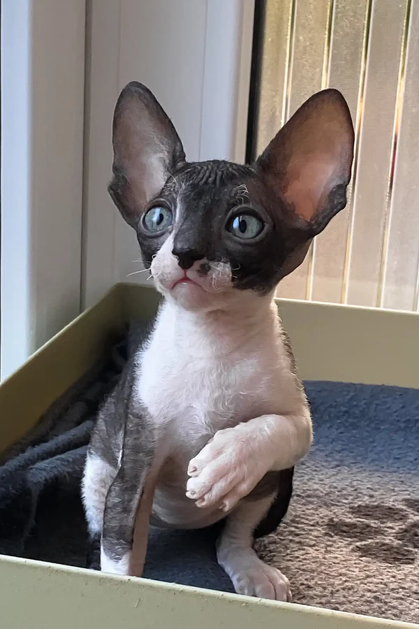 Hi there… my name is Ulita, and I’ve been waiting just for you. I’m a breathtaking female Cornish rex cats for sale, and at just 8 weeks old, I’m already a heart-stealer with my elegant black bicolor coat and bright yellow eyes that seem to glow when I’m happy which is pretty much all the time. My soft, wavy coat is a dream to touch, and the best part? It doesn’t shed. That means no fur on your clothes or furniture just clean cuddles and hypoallergenic love. I come from rare bloodlines, carefully bred for health, beauty, and personality, and I’ll grow into a graceful feline companion weighing approximately 5-9 lbs.